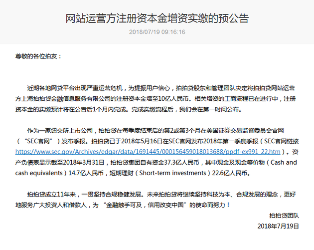 新浪科技讯 7月19日下午消息,今日,拍拍贷在官网发布《网站运营方注册资本金增资实缴的预公告》称,近期各地网贷平台出现严重运营危机,为提振用户信心,拍拍贷股东和管理团队决定将拍拍贷网站运营方上海拍拍贷金融信息服务有限公司的注册资本金增至10亿人民币。