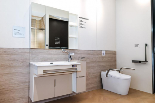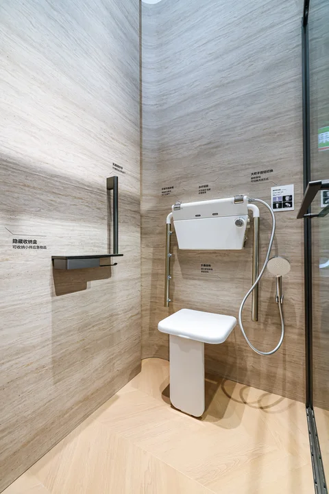 适老好房子展区展示的电动升降浴室柜支持自由调节高度,可实现台盆的升降,适配不同身形长者,无论是站立还是坐着洗漱,都能找到最舒适的角度。智能健康护理一体机将智能马桶与智能护理相融合,搭载自研自创医疗级算法模块,通过AI数智科技,在如厕过程中就能进行14项尿检健康指标,精准生成检测报告与历史数据分析,帮助用户实现疾病早筛与日常健康检测管理。康养淋浴器可站可坐,有效避免老年人沐浴时久站眩晕、滑倒跌伤,两侧雾化喷淋臂360°喷淋,带来包裹式淋雨体验,还支持三档定位、恒温出水,洗浴过程舒适又安全。